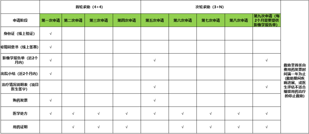 次轮 求助:自行使用3周期+救助至首张自费用药发票时间满一年为止 (救助期间疾病进展、或医生评估不适合继续用药治疗的停止救助)